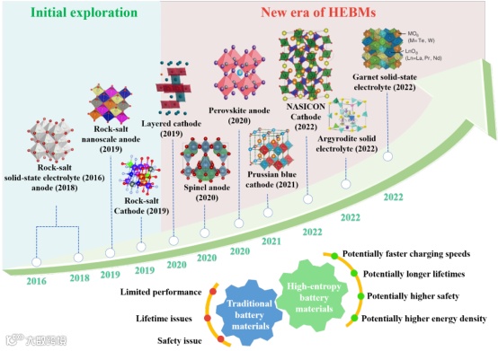 随着全球对先进储能解决方案的需求不断增加,探索创新战略变得日益重要。作为能源存储设备的核心组件,电池技术在能源应用领域中备受关注。然而,传统的材料改性策略在提升电池性能方面仍存在一定的局限性,这促使研究人员积极寻求更高效的材料设计方法。近年来,高熵概念作为一种革命性的材料开发方法,被广泛应用于可充电电池材料的合成与设计(图1)。得益于更加无序的组分,高熵电池材料(HEBMs)通常表现出优于传统功能材料的性能特性。