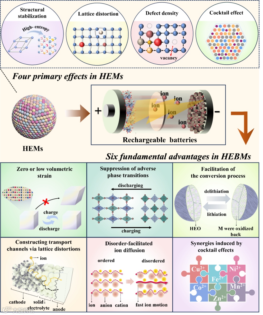 元素之间复杂的相互作用使得HEMs展现出独特的性质,包括鸡尾酒效应、晶格畸变、高缺陷密度和结构稳定。随着高熵策略逐渐被引入到可充电电池材料的开发当中,这些高熵电池材料 (HEBMs) 也表现出优于传统材料的电化学性能,而这与系统构型熵的增加和组分无序密切相关,即HEBMs的六大基本优势:(1)零/较低的应变水平(2)抑制不可逆相变(3)促进转化过程(4)晶格畸变构建离子传输通道(5)无序促进离子扩散(6)鸡尾酒效应诱导的协同作用。