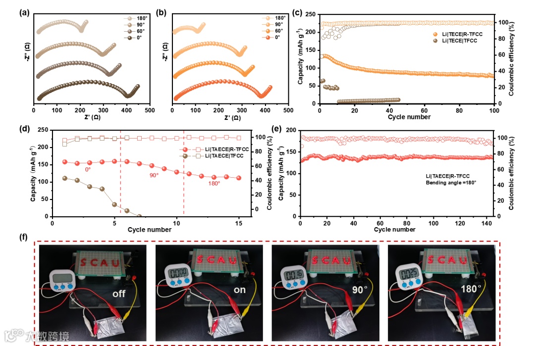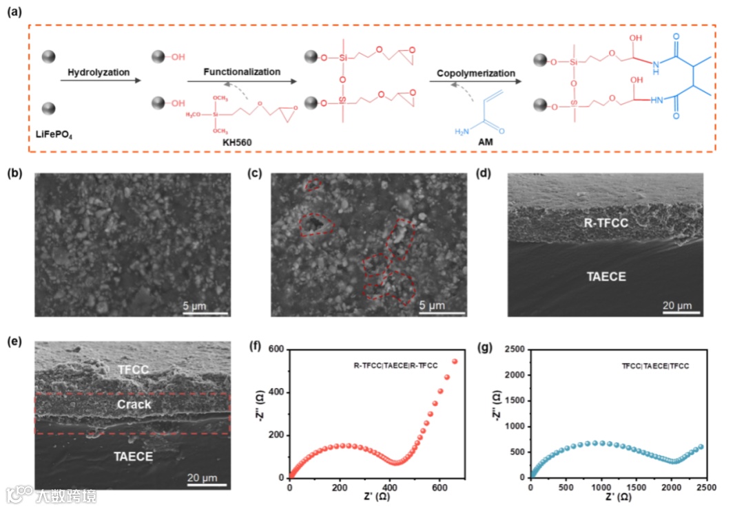 此外,作者还探讨了通过目标导向的界面反应构建共价电极/SE界面在降低界面阻抗方面的普适性。例如,作者利用反应性柔性正极(即具有环氧官能团的热塑性聚氨酯/LiFePO4复合电极,R-TFCC)和反应性柔性SE(即具有-NH2末端键的热塑性聚氨酯/聚(丙烯酰胺)/聚(乙二醇)-二丙烯酸酯复合电解质,TAECE)之间的开环反应,构建了共价柔性正极/SE界面。通过SEM证实了R-TFCC均匀粘附在TAECE上,没有明显的界面空隙,增加了界面的有效接触面积,进而降低界面阻抗。这些发现证实了共价键合策略在降低FSSLB界面阻抗方面的普适性和有效性。