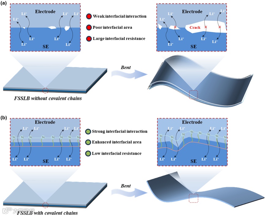 图1. FSSLB中 (a) 基于非共价相互作用的电极/SE界面和 (b) 基于共价相互作用的电极/SE界面示意图。