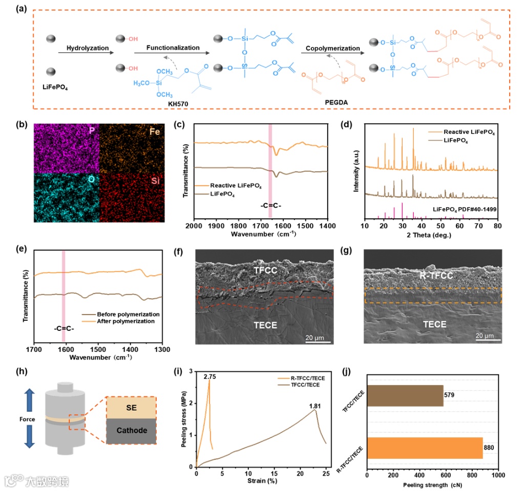 作者利用反应性柔性正极(即具有C=C官能团的热塑性聚氨酯/LiFePO4复合电极,R-TFCC)和反应性柔性SE(即具有C=C末端键的热塑性聚氨酯/聚(乙二醇)-二丙烯酸酯复合电解质,TECE)之间的自由基引发反应,构建了共价柔性正极/固态电解质界面。通过FTIR等表征技术证明了C=C官能团的成功接枝,以及R-TFCC/TECE界面处稳定共价链的形成。同时,通过SEM和剥离测试等手段证实了R-TFCC均匀粘附在TECE上,没有明显的界面空隙,增加了界面的有效接触面积。