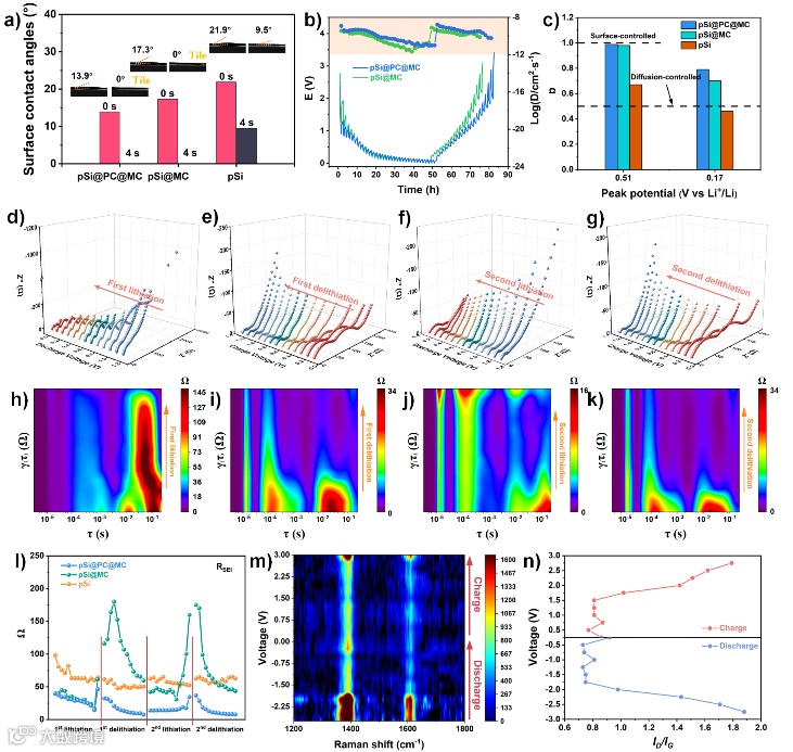 pSi@PC@MC材料表现出高的容量保留(1650 mAh g-1,300圈)、优异的倍率性能和卓越的循环稳定性(2 A g-1,1000圈,866.3 mAh g-1容量保留)。与其他已报道的硅碳负极材料相比,表现出明显的优势。此外,利用恒电位间歇滴定法(GITT)和循环伏安法(CV)测试阐明了锂离子传输机制。原位拉曼和原位电化学阻抗谱测试揭示了锂离子存储机制。(图2)