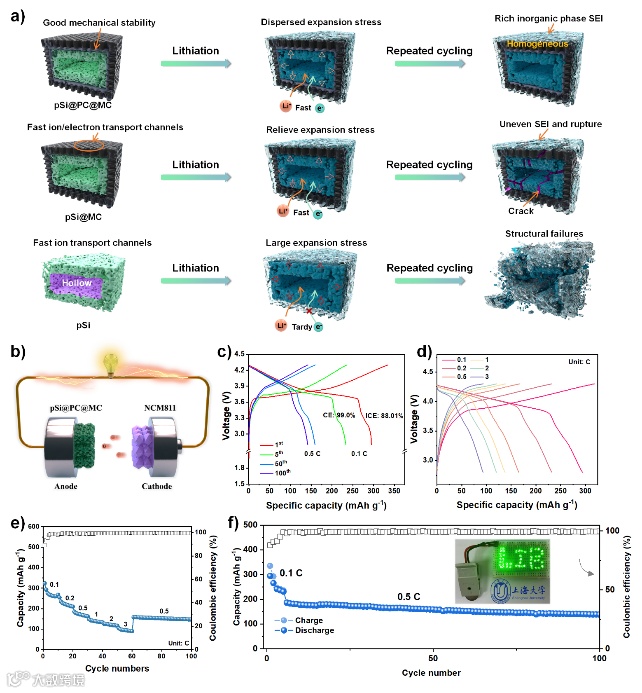 图4描述了pSi@PC@MC、pSi@MC和pSi电极在充放电过程中的结构演变。pSi因低电导率导致锂离子和电子传输缓慢,循环中产生严重极化,且由于纯pSi颗粒的体积膨胀,结构易崩塌,需更多锂离子形成厚的SEI膜。此外,尽管MC层提高了pSi@MC的结构稳定性,但硅的持续体积变化仍会导致MC层断裂,影响长循环性能。引入的PC中间层有效缓冲体积变化和应力,且与外层多孔碳层紧密结合,提供快速的电子/离子传输网络和坚固的结构框架。最终,pSi@PC@MC负极材料展现出优异的电化学储锂性能。pSi@PC@MC//NCM811全电池在0.5C下经过100次循环后,具有高达140.1 mAh g-1的可逆容量和75.8%的优异保持率。
