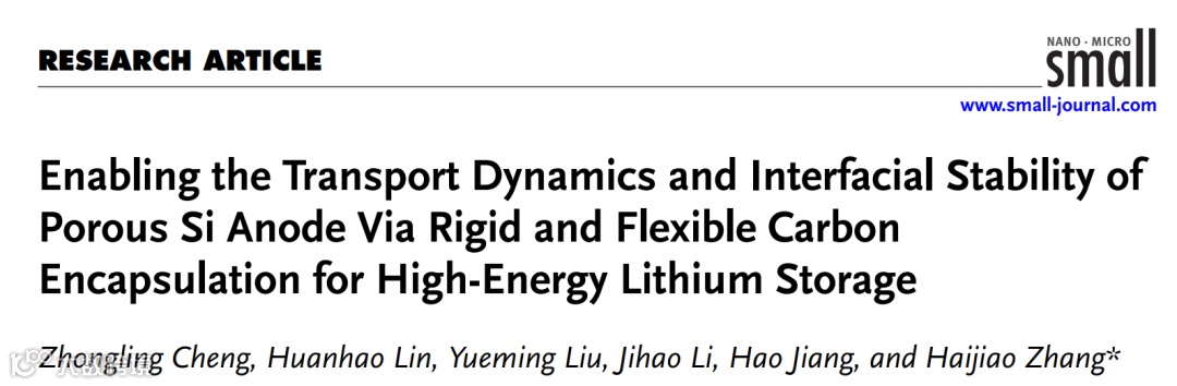 近日,上海大学张海娇教授团队在国际知名期刊《Small》上发表题为“Enabling the Transport Dynamics and Interfacial Stability of Porous Si Anode via Rigid and Flexible Carbon Encapsulation for High-Energy Lithium Storage”的研究型论文。该工作以石油沥青和多巴胺作为碳源,依次包覆空心多孔硅制备出“刚柔并济”的硅碳复合材料(pSi@PC@MC)。有限元模拟分析揭示了刚性和柔性碳封装对多孔硅负极在锂离子存储中的应力释放效应。原位/非原位表征结果进一步阐明,混合sp2/sp3碳涂层极大地提高了液/固界面稳定性和与电解质的兼容性,并促进了电子/离子传输动力学,从而形成均匀稳定的且富含无机LiF相的SEI膜,最终有效提升了锂存储性能。