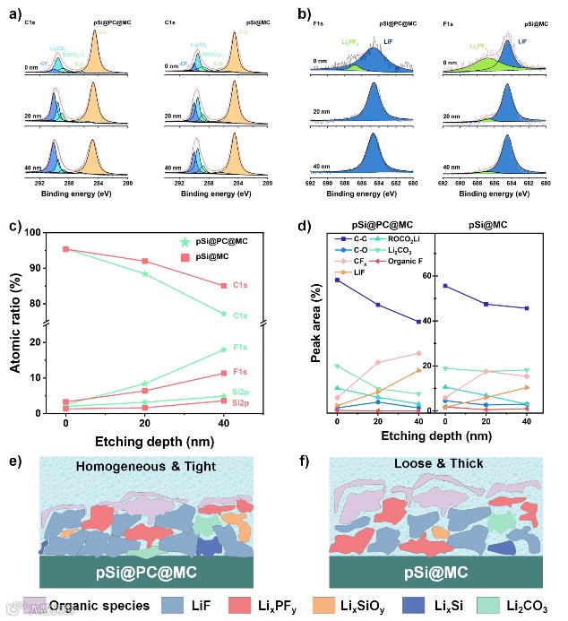 为探究锂存储性能改善的原因,研究了材料循环后的SEI膜组成分布。图3显示了pSi@PC@MC和pSi@MC电极的XPS蚀刻结果。pSi@PC@MC的SEI膜包含有机溶剂分解产物,如LiF、Li2CO3和ROCO2Li,丰富的LiF有助于提高电化学和机械稳定性。随着蚀刻深度增加,pSi@PC@MC中LiF的相对峰强度增强,而pSi@MC中仅出现少量LixPFy,表明PC层提高了界面兼容性,抑制了电解质分解。pSi@PC@MC的F含量高于pSi@MC,显示出更多LiF相的形成。最终,pSi@PC@MC电极展现出均匀、稳定且富含LiF的SEI膜,增强了电极界面的稳定性,提升了锂存储性能。