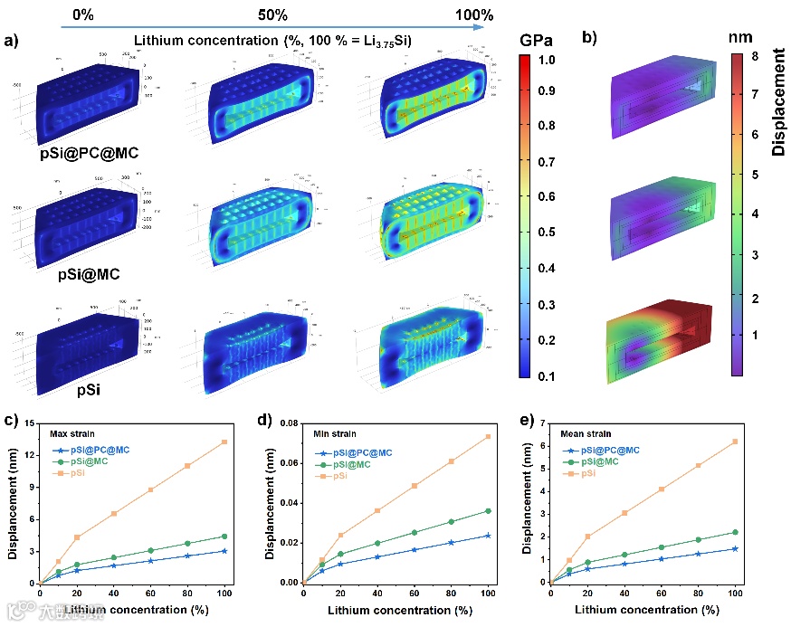 图1. 模拟硅基材料完全锂化前后颗粒和单位体积变化的连续尺度分析。(a) 不同锂化状态下pSi@PC@MC、pSi@MC和pSi的应力分布,(b) 完全锂化状态下三种电极材料的体积位移,(c) 最大位移,(d) 最小位移,以及(e) 锂化过程中三种电极材料的平均应力