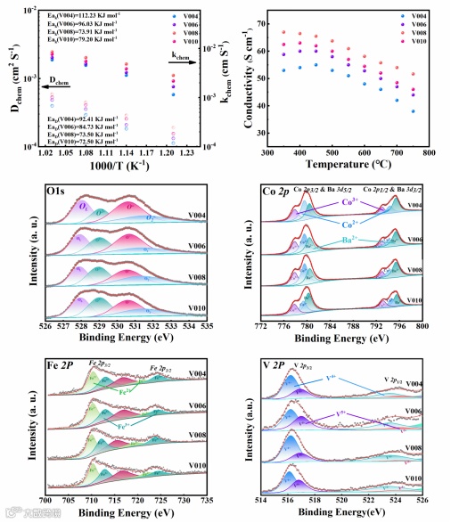 V004-010阴极材料的导电性能和表面交换行为经过多方位研究。图3a显示,V004、V006和V008材料表现出从半导体到金属的过渡,且导电性随V2O3含量增加逐渐表现出金属特性。该导电性与Co、Fe的氧化态相关,Co3+ /Fe3+―O2-―Co2+/Fe2+跳跃导电模式主导了导电机制。氧交换行为方面,V008的Dchem和kchem明显高于其他样品,表明BaVO3相和PBCF层的协同作用有效提升了氧吸附和离子迁移性能。XPS分析表明,V004-010样品中Co和Fe主要存在+2和+3价态。V2O3调控使得这些异质结构的电子性能优化,提高了材料的催化活性,V008复合材料展示了优异的导电性和氧交换性能,适用于高效PCFCs应用。