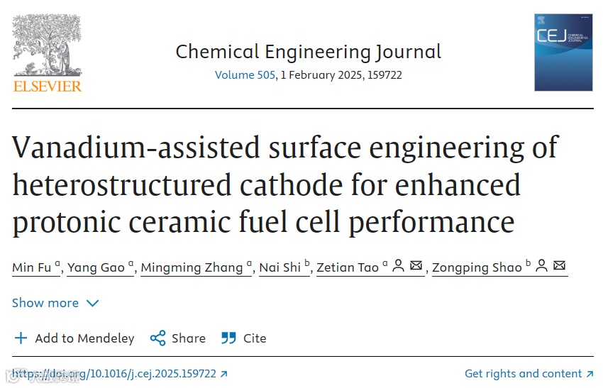 近日,来自南华大学的陶泽天教授与科廷大学的邵宗平教授合作,在国际知名期刊《Chemical Engineering Journal》上发表了题为《Vanadium-assisted surface engineering of hetero-structured cathode for enhanced protonic ceramic fuel cell performance》的实验文章。该文章展示了一种基于酸性氧化物诱导自组装的表面工程策略,用于精确调控镨钡钴铁氧体
