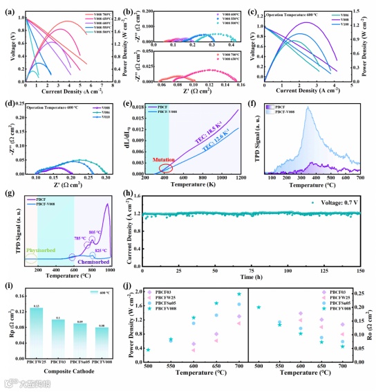 为了研究PBCF-V系列阴极在PCFC中的ORR活性,研究团队进行了全面的性能对比分析。单个PCFC的断面形貌表明单电池由阴极层、电解质层、阳极功能层和阳极层组成。为确保单电池的欧姆电阻较低,电解质的厚度被精确控制为6μm。不同组成的PBCF-V系列阴极在燃料电池模式下进行了测试,结果显示PBCF-V008系统的阴极在PCFC中表现出卓越的电化学性能。图5a显示了PBCF-V008阴极在不同温度下(700°C至500°C)测得的I-V-P曲线,而图5b展示了同一阴极在OCV条件下的EIS曲线。测试结果表明,PBCF-V008阴极的PCFC在550°C至700°C的温度范围内,最大输出功率分别为0.65 W cm-2、1.26 W cm-2、1.68 W cm-2 和1.93 W cm-2。