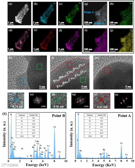 研究进一步通过高分辨率分析(图2k)观察到两种不同的晶面,其晶面间距分别为0.24 nm和0.28 nm,对应于BaVO3(200)和BaCoO3(110)晶面。这一发现揭示了Ba迁移导致PBCF表面层晶格间距发生收缩(图2l)。通过对特定位置的EDS扫描(图2t),研究表明PBCF-V008复合材料中同时存在Ba、V缺乏相(占7.89%和2.06%)和Ba、V富集相(占8.23%和8.12%),并与X射线衍射(XRD)精修结果高度吻合。研究进一步推断,表面纳米颗粒主要由BaVO3组成,而基体内表面则形成了PBCF@BaVO3结构。