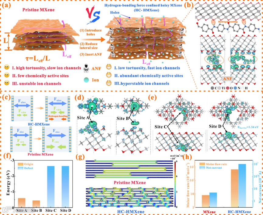 图 1. a HC-HMXene 膜相对于 MXene 膜的具体优势示意图。b MXene 和 ANF 之间氢键形成的原子结构和差电荷示意图。c浸泡过程中 MXene 和 HC-HMXene 的微观作用力示意图。d MXene 和e HMXene上不同位点的差电荷图。f不同位点的Zn2+ 吸附能汇总。g使用 COMSOL 软件模拟原始 MXene 和 HMXene 中的离子传输通量。