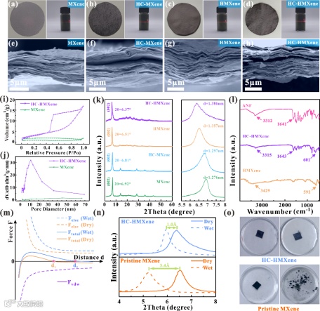 图 3. a-h 不同 MXene薄膜的光学图像、丁达尔效应和截面 SEM 图像。i MXene 和 HC-HMXene 的氮吸附-解吸等温线和j 孔径分布。k 不同 MXene 薄膜和 MAX 的 XRD图。l ANF 和不同 HMXene 薄膜的傅立叶变换红外光谱。m 范德华吸引力和静电排斥力的总作用力随层间距离变化的示意图 。n 根据 XRD 图样获得的 MXene 和 HC-HMXene 膜在水溶液中离子纳米通道的稳定性比较。o MXene 和 HC-HMXene 薄膜浸泡前后稳定性的数字图像。