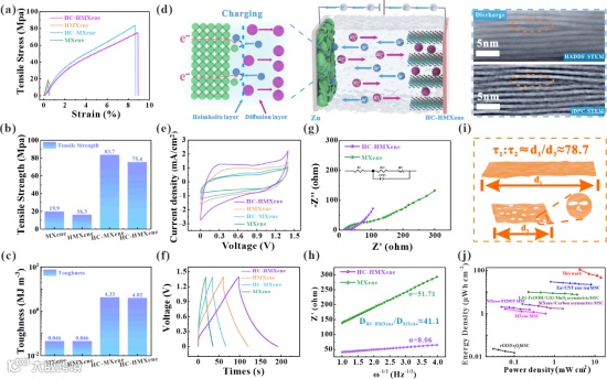 图4. a 不同 MXene 基薄膜的拉伸应力-应变曲线、b 拉伸强度和c 韧性 。d ZIMC 在充电过程中的工作机制以及放电过程中Zn2+插入的 iDPC 和 HADDF 图。e 不同 MXene 基 ZIMC 的 CV 和f GCD 曲线。g-h HC-HMXene 和基于 MXene 的 ZIMC 的EIS图以及相应扩散系数的计算。i 迂曲度计算示意图。j 该工作与文献中报道的其他工作相比较。