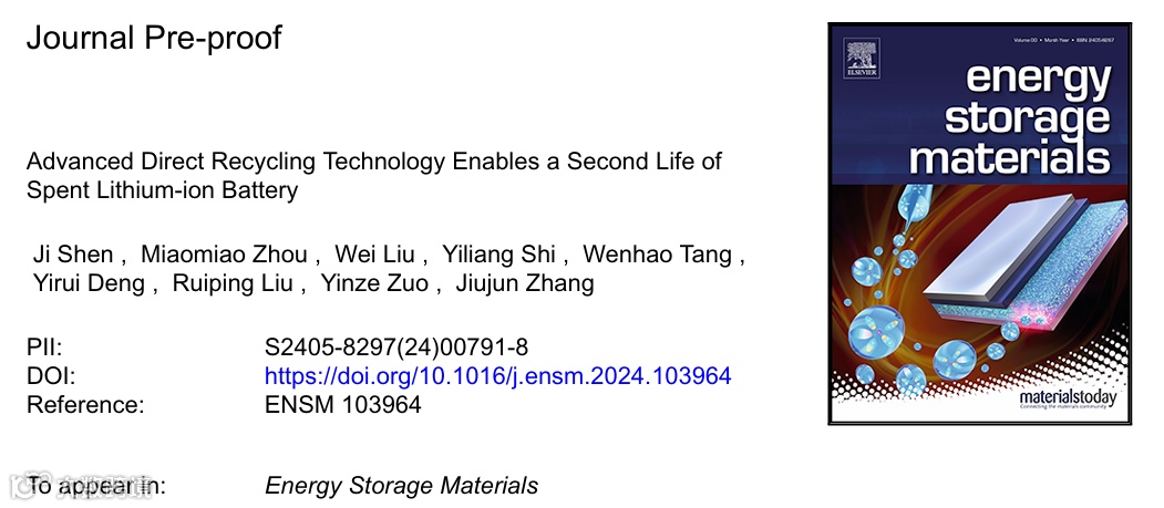基于此,来自中国矿业大学(北京)的刘瑞平教授,福州大学的左银泽副教授与福州大学和上海大学的张久俊教授合作,在国际知名期刊Energy Storage Materials上发表题为“Advanced Direct Recycling Technology Enables a Second Life of Spent Lithium-ion Battery”的综述文章。该观点文章分析了现在热度较高的废旧锂离子电池直接回收技术,同时汇总了近期在废旧锂离子电池直接回收技术问题上的进展。