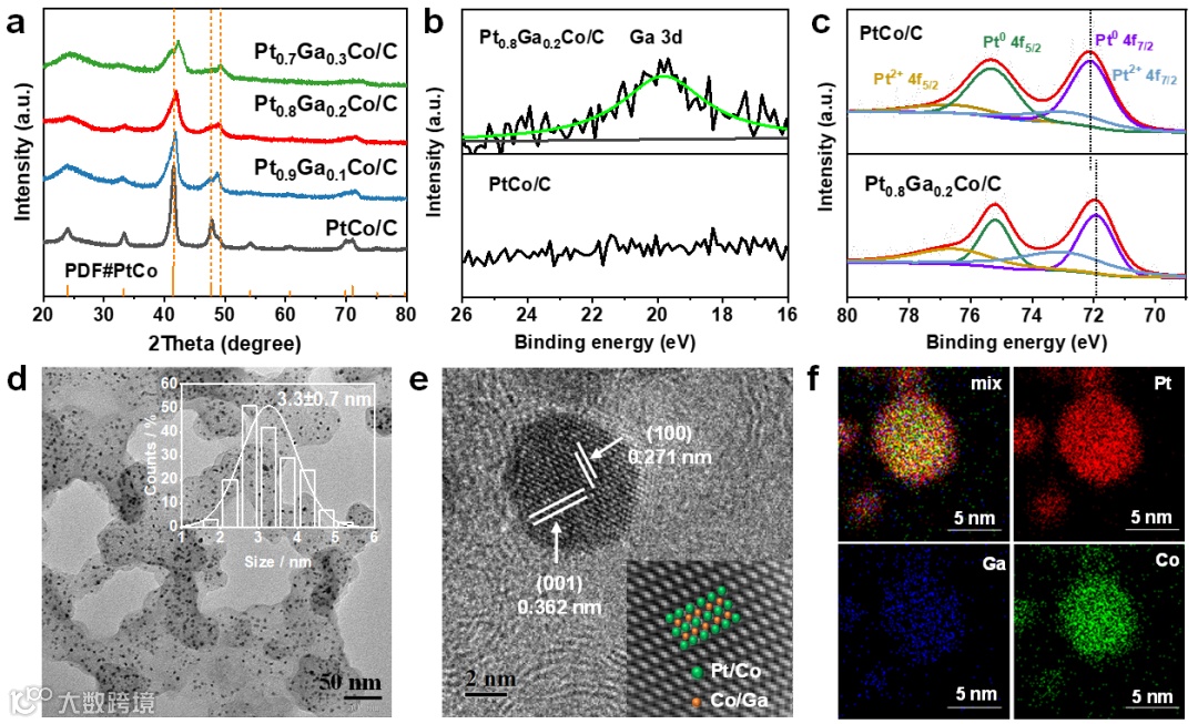 通过冷冻干燥-热还原法制备所设计的低铂金属间催化剂,实验发现,适量Ga能够实现低铂催化剂有序相的形成,而过量Ga的引入会造成竞争杂相的产生。所制备Pt0.8Ga0.2Co/C具有高度分散的纳米颗粒,平均粒径为3.3 nm。热力学计算和电荷局域函数分析表明,Ga部分替代的L10型PtCo相比传统PtCo具有更低的热力学形成能,这归因于Pt与Ga之间强烈的d-p电子相互作用。进一步的原子占位分析显示,相比Ga位于Pt亚点阵,Ga位于Co亚点阵而富余的Co位于Pt亚点阵时,所形成的结构更稳定,而这是源于该结构中Ga能与更多Pt原子进行配位,且配位距离更短。