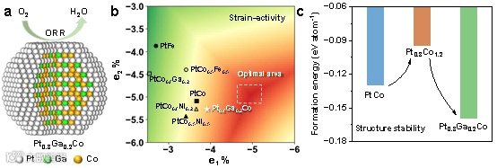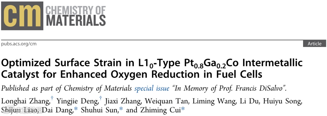 近日,来自华南理工大学的崔志明教授,加拿大国立科学研究院的孙书会教授,以及广东工业大学的党岱副教授,在国际知名期刊Chemistry of Materials上发表题为“Optimized Surface Strain in L10-Type Pt0.8Ga0.2CoIntermetallic Catalyst for Enhanced Oxygen Reduction in Fuel Cells”的文章。该文章采用Ga部分替代Pt的策略,开发出高性能的L10型Pt0.8Ga0.2Co金属间化合物催化剂。Ga的引入,一方面调控了表面应变,使其接近理论火山图的最佳区域;另一方面,促进了热力学上更稳定的金属间化合物结构的形成,实现了低铂催化剂的长期电化学稳定性。