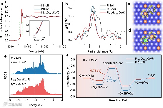 通过XAFS表征进一步验证了Pt与Ga之间的电子相互作用,Pt位点的部分取代以及Pt0.8Ga0.2Co中缩短的Pt-Pt间距。进一步的理论计算表明,相较于PtCo,Pt0.8Ga0.2Co能对表面Pt产生更强的表面应变,且靠近了二维应变-活性火山图的最优区域。优化后的应变显著调控了含氧物种的吸附特性,降低了反应能垒,从而提升了ORR的反应动力学。