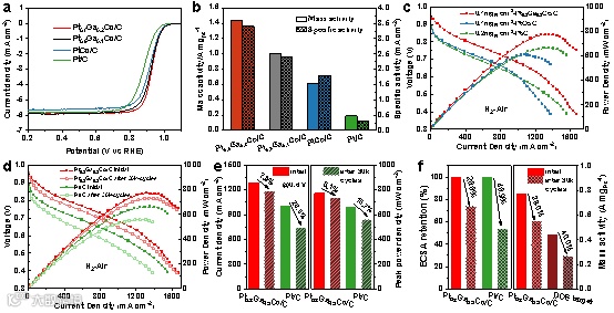 所制备的Pt0.8Ga0.2Co/C催化剂在旋转圆盘电极上展现出了卓越的本征活性,达到3.39 mA cm-2,优于PtCo/C和Pt/C。在PEMFC测试中,Pt0.8Ga0.2Co/C在0.90 V下的质量活性高达0.77 A mgPt-1,不仅超过了美国能源部(DOE)设定的活性目标(0.44 A mgPt-1,0.90 V),还优于大多数L10型Pt基金属间化合物催化剂。值得一提的是,该催化剂表现出卓越的催化耐久性,在经过30,000次电位循环后,质量活性仅下降28%,显著优于DOE设定的40%质量活性损失目标。