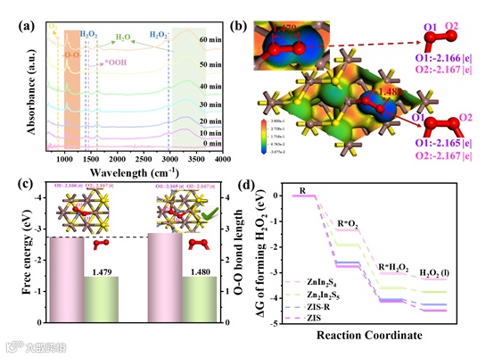 原位红外(FTIR)表明 O2 是以“桥连接”方式吸附在催化剂表面,通过 DFT 计算发现,拥有中间晶面的 ZIS-2 不仅降低了 O2 吸附的吉布斯自由能,结构表面的电子环境也发生了很大变化,而且调控的“桥连接”方式可以实现 2e- 的 H2O2生成路径,可以一步直接从 O2 到 H2O2 。综上,半相干界面调控了固有的化学和能量相互作用,从而操纵了反应物的吸附模式和表面反应能量,实现了 2e- 过程的“桥吸附”模式,一步生成 H2O2,从而提高了光催化 H2O2生成率。