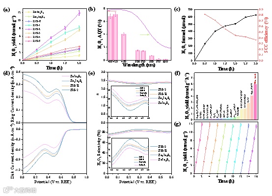 在可见光下, ZIS-2 表现出优异的光催化活性,较高的量子产率(AQY)以及太阳能-化学能转换(SCC)效率,高效稳定地生产过氧化氢,为可持续生产 H2O2提供了潜在可能性。