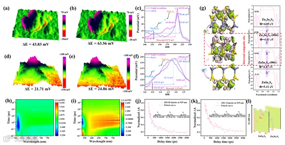 通过开尔文探针显微镜(KPFM)探究光照前后催化剂的电势变化情况来判断载流子迁移路径。随后,密度泛函理论(DFT)计算了 ZIS-2 的差分电荷密度和功函数,验证了中间晶面提供复合平台的可能。最后,瞬态吸收(TA)光谱可以证明了中间复合平台的存在。中间晶面为内部电荷复合提供了一个平台,并为 BEF 提供了强大的驱动力,避免了界面电荷的随机迁移,从而提高了载流子利用率。