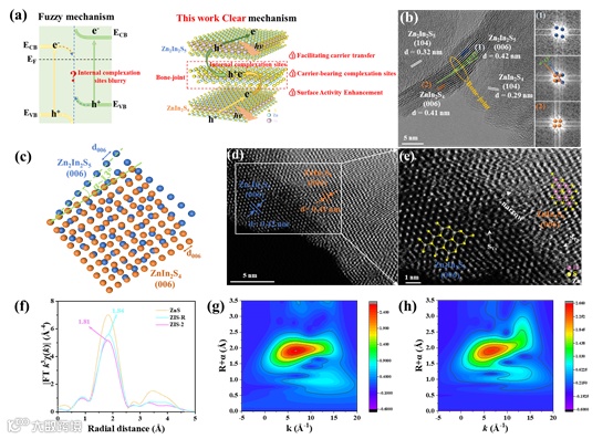 TEM 可以清晰看出骨关节结构连接模型,通过傅里叶变换(FTT)和晶面模型的旋转变换发现, ZnIn2S4-(006) 和 Zn2In2S5-(006) 旋转约 13° 可以相互匹配,并表明由于原子间距离和晶体对称性的差异,在异质结中存在骨连接。此外,利用球差电镜(HAADF-STEM)获得连续相干界面的详细信息。同步辐射 X 射线吸收近缘结构(XANES)和扩展 X 射线吸收精细结构(EXAFS)光谱技术来解析晶体结构的差异以及局域配位环境方面的差异。