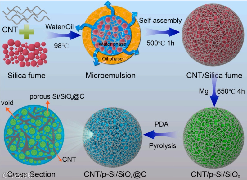 图1. 以硅灰为硅源的负极微球的制备示意图