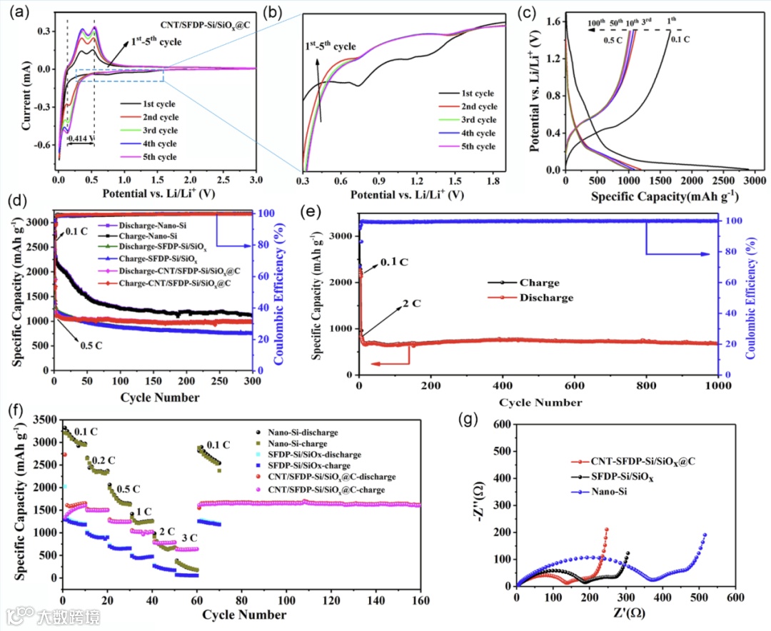 图3 (a)CNT/SFDP-Si/SiOx@C的CV曲线,(b)图(a)的局部放大图,(c)CNT/SFDP-Si/SiOx@C的代表性充放电曲线,(d)不同材料在0.5C下的循环性能对比,(e)CNT/SFDP-Si/SiOx@C在2C电流密度下的长循环性能,(f)不同电流密度下的倍率性能,(g)电极循环100圈后的EIS。