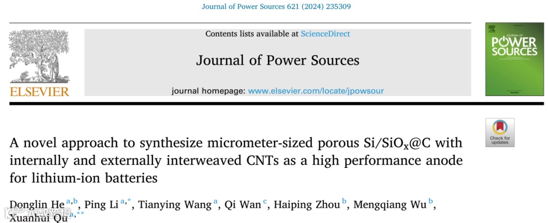 近日,来自北京科技大学的李平教授与曲选辉教授团队,在国际知名期刊Journal of Power Sources上发表题为“A novel approach to synthesize micrometer-sized porous Si/SiOx@C with internally and externally interweaved CNTs as a high performance anode for lithium-ion batteries”的观点文章。该观点文章研究了以硅灰为硅源,同时加入CNT合成硅负极微球的制备方法,同时分析探讨了这种微球结构的优势。