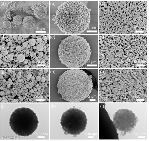 图 2 (a-c)硅灰微球SEM图,(d-f)CNT/硅灰微球SEM图,(g-i)CNT/SFDP-Si/SiOx@C微球SEM图;(j)硅灰微球TEM图,(k)CNT/硅灰微球TEM图,(l)CNT/SFDP-Si/SiOx@C微球TEM图。