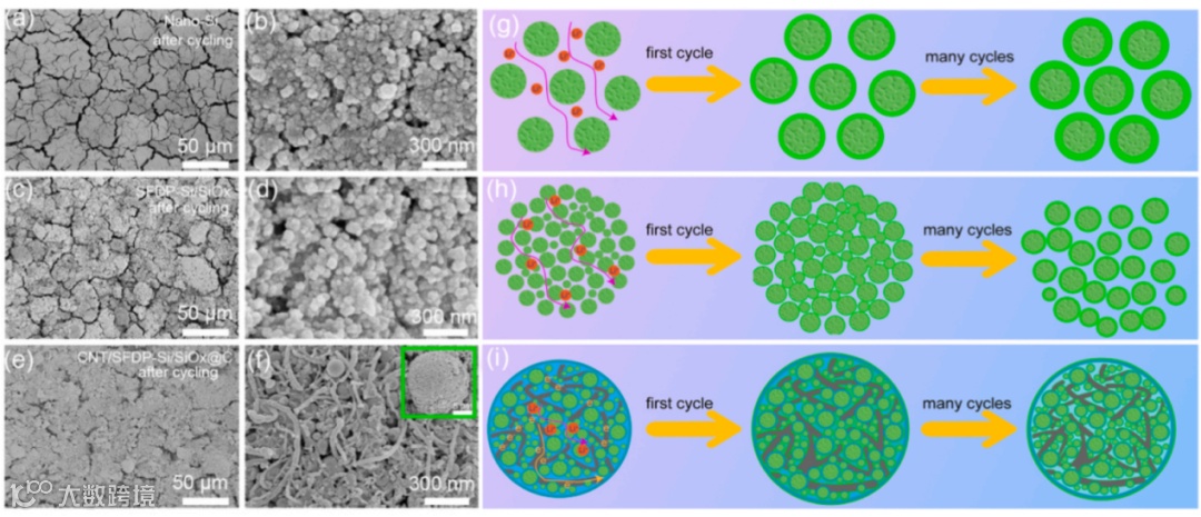 图4 (a, b)Nano-Si,(c, d)SFDP-Si/SiOx及(e, f)CNT/SFDP-Si/SiOx@C极片循环100圈后的SEM照片;(g)Nano-Si,(h)SFDP-Si/SiOx,(i)CNT/SFDP-Si/SiOx@C微球在循环过程中的结构变化示意图。