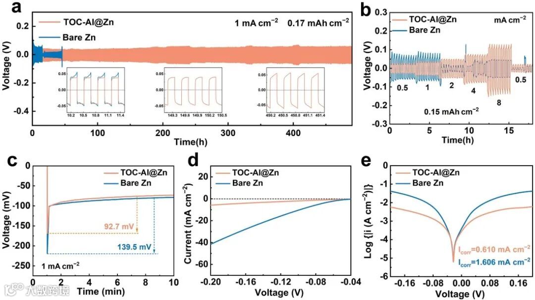 图6. TOC-AI 作为锌负极保护层(TOC-AI@Zn)的电化学性能。