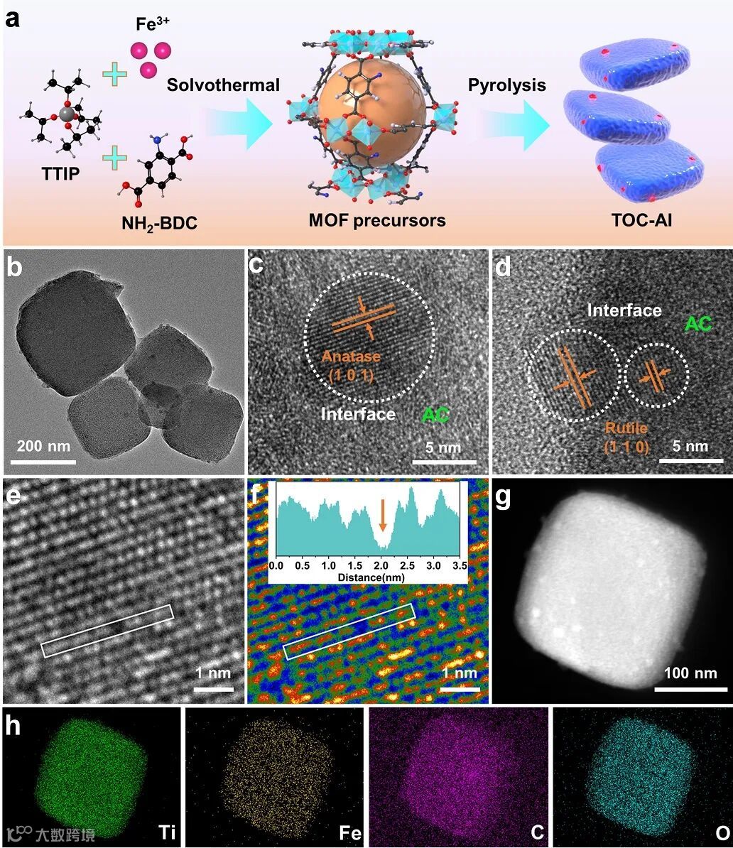 基于此,江苏大学材料学院徐晖课题组采用金属有机框架作为前驱体,通过精确调节配位参数,严格控制反应条件,并适当引入添加剂,成功制备了一种界面浓度高、相容性好且稳定的TiO2/C复合材料 (TOC-AI)。在该材料中,超细的TiO2纳米晶体均匀地分散在非晶碳骨架中,形成了连续的导电网络和丰富的异质界面(图1a)。这种原子级界面接触和强交互作用明显优于传统的TiO2/C复合材料(图1b),从而实现了电子和离子在界面处的解耦传输(job-sharing)。研究还发现钛空位能够促进锌离子嵌入界面,提供了额外的容量。