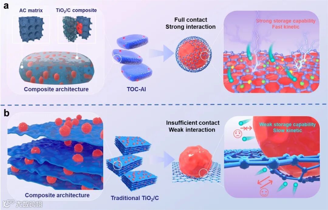图1. TiO2与C的复合结构示意图:(a) TOC-AI,(b)传统的TiO2/C复合材料。