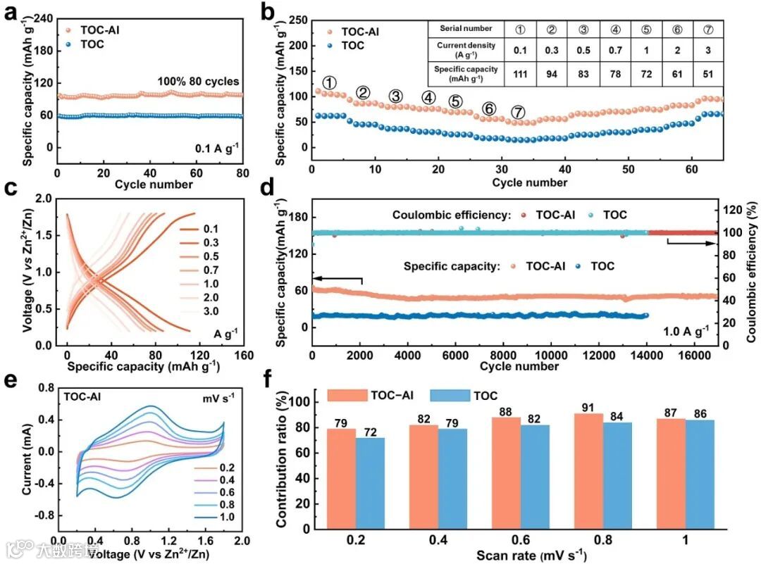 图4. TOC-AI作为AZIBs正极材料的电化学性能:(a) 循环性能,(b) 倍率性能,(c) 充放电曲线,(d) 长循环性能,(e) 循环伏安曲线,(f) 电容贡献。