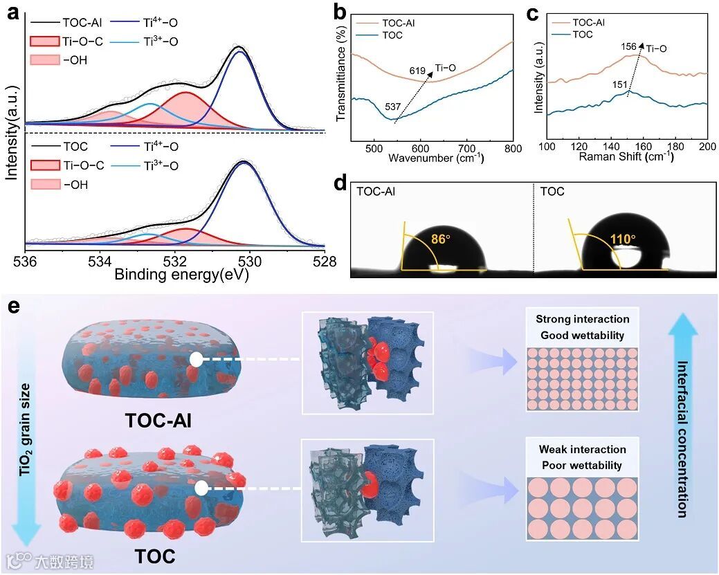 图3. (a-d) TOC-AI的XPS光谱,Raman光谱、FTIR光谱和接触角测试,(e) TiO2的晶粒尺寸与界面浓度的关系示意图。