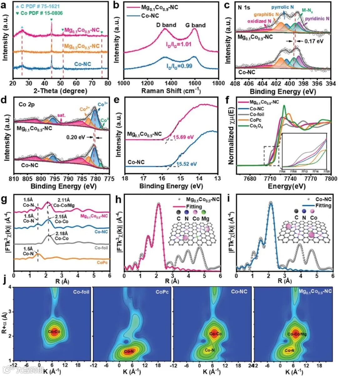图3. a) Mg0.1Co0.9─NC、Mg0.5Co0.5─NC和Co─NC的XRD谱图。b) Mg0.1Co0.9─NC和Co─NC的拉曼光谱。Mg0.1Co0.9─NC的c) N 1s和d) Co 2p高分辨率XPS光谱。e) 催化剂的UPS能谱图。f) Co k边XANES光谱和g) k3加权EXAFS光谱的傅里叶变换。h) R空间下Mg0.1Co0.9─NC的Co-EXAFS拟合结果(嵌图,Mg0.1Co0.9─NC的结构模型)。i) Co─NC在R空间的Co- EXAFS拟合结果(嵌图,Co─NC结构模型)。j) Co箔、CoPc、Co─NC和Mg0.1Co0.9─NC的Co k边WT-EXAFS光谱。