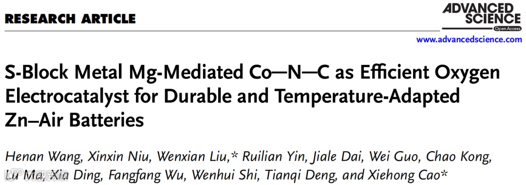 近日,浙江工业大学材料科学与工程学院的曹澥宏教授和刘文贤副教授,在Advanced Science上发表题为“S-Block Metal Mg-Mediated Co─NC as Efficient Oxygen Electrocatalyst for Durable and Temperature-Adapted Zn–Air Batteries”的研究文章。该文章报道了一种S区金属Mg调制的Co─NC催化剂,用于提高锌空气电池(ZABs)在宽温度范围内的工作能力,显示了其在多样化环境条件下的实际应用潜力。