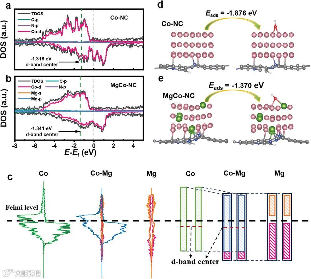 图1. Co─NC和MgCo─NC的态密度(DOS)图、轨道杂化分析以及*OH中间体在两种催化剂上的吸附能计算。