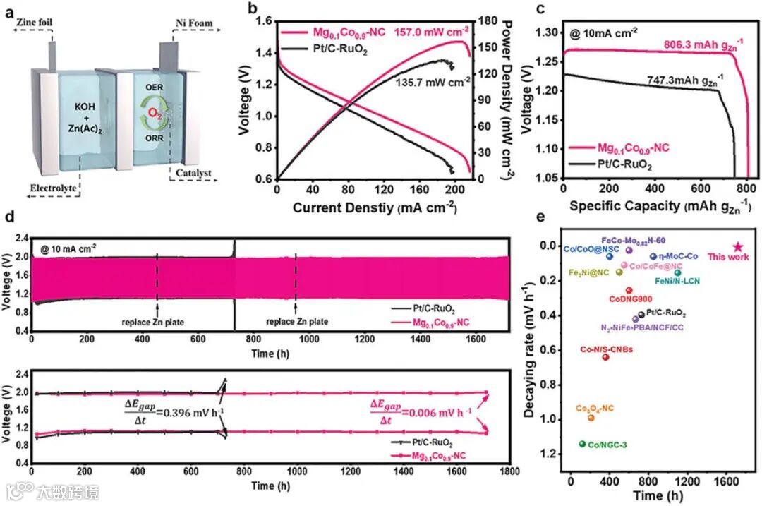 图5. 以Mg0.1Co0.9─NC和Pt/ C-RuO2为空气阴极的ZABs性能。a) ZABs示意图。b)放电极化和功率密度曲线。c)电压与比容量曲线。d)充放电循环曲线及电压随循环时间的变化。e) Mg0.1Co0.9─NC基ZAB的循环稳定性和衰减速率与其他近期报道的比较