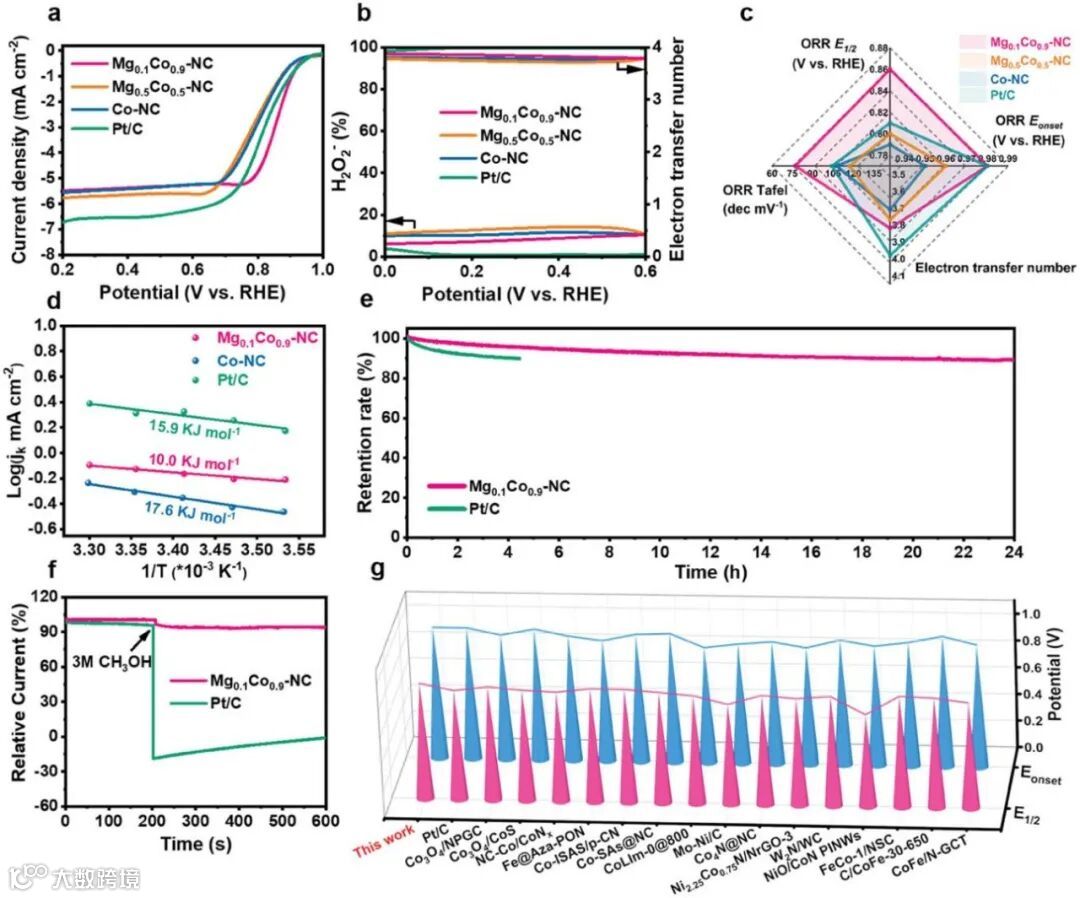 图4. a) Mg0.1Co0.9─NC、Mg0.5Co0.5─NC、Co─NC和Pt/C的ORR极化曲线。b)样品的H2O2选择性和电子转移数。c)催化剂的半波电位、起始电位、电子转移数、塔菲尔斜率的比较。d) Mg0.1Co0.9─NC、Co─NC和Pt/C的活化能。e) ORR稳定性和f) Mg0.1Co0.9─NC和Pt/C耐甲醇试验。g) Mg0.1Co0.9─NC与最近报道的其他电催化剂的ORR半波电位和起始电位的比较。