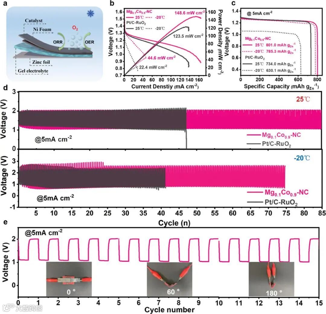图6. 以Mg0.1Co0.9─NC和Pt/C-RuO2为空气阴极的柔性ZABs性能。a)柔性ZABs示意图。b)放电极化和功率密度曲线。c)比容量曲线。d) 25°C和- 20°C的充放电循环曲线。e)不同弯曲角度(0°、60°、180°)的充放电循环曲线