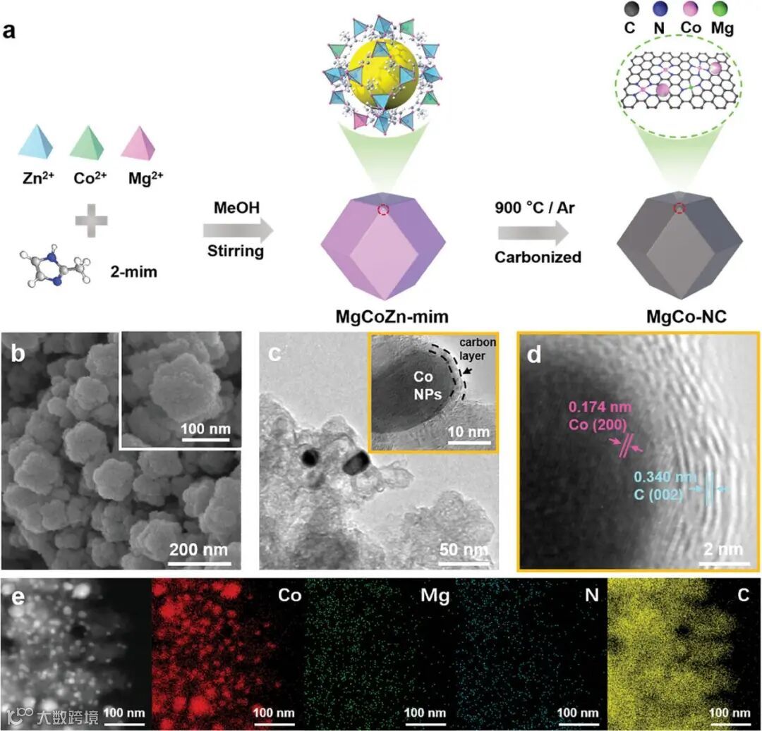 图2. a) MgCo─NC 催化剂的制备示意图。b) Mg0.1Co0.9─NC的 SEM、c) TEM 和 d) HRTEM 图像。e) Mg0.1Co0.9─NC 的 EDS 元素图谱。
