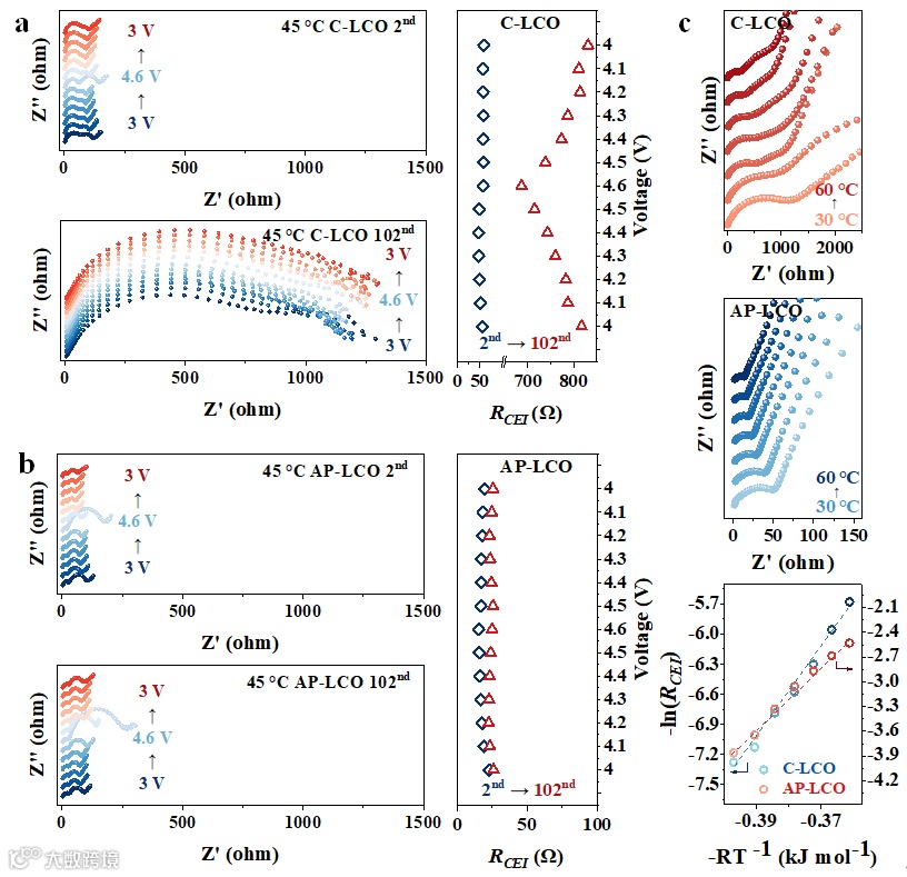 在45°C下,C-LCO电池在第2次和第102次循环后的原位EIS测试显示,CEI电阻显著增加了一个数量级以上,表明CEI在循环过程中逐渐恶化。相比之下,AP-LCO的RCEI值显著较低,从第2次到第102次循环仅略有增加,并且在第102次循环的充放电过程中几乎保持不变。此外,在45°C下,第102次循环时的活化能(Ea)计算显示,AP-LCO的CEI的Ea值为38.3 kJ mol⁻¹,显著低于C-LCO的45.6 kJ mol⁻¹,表明AP-LCO的CEI具有更低的Li+扩散屏障。由于优化的CEI,AP-LCO在循环后表现出稳定且加快的Li+传输动力学,低活化能的CEI确保了低极化,并改善了扩散和赝电容过程,从而增强了AP-LCO在45°C下的倍率性能。