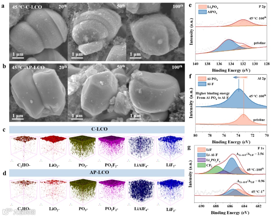 我们通过原位IR、XPS、SEM、TEM等方法揭示了AP-LCO表面CEI化学性质和形态的演变。在45°C下经过20、50和100次循环后,对AP-LCO和C-LCO的SEM测量显示,AP-LCO的粗糙表面随着循环逐渐演变为具有均匀且致密CEI的光滑表面。这个坚固的CEI增强了AP-LCO的颗粒完整性,100次循环后未见裂纹。相比之下,C-LCO表面大量副反应产物堆积,100次循环后形成了松散多孔的CEI。由于保护性较差,C-LCO的颗粒上出现明显裂纹。飞行时间二次离子质谱测试清楚地显示了CEI中各种化学物质的空间分布。