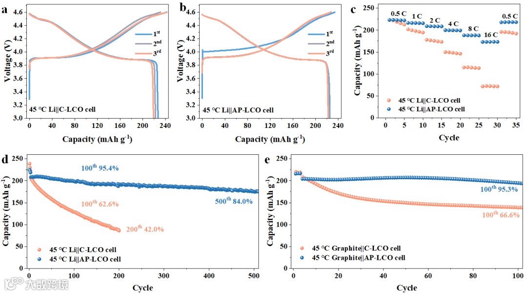 AP-LCO的电化学性能在室温和高温下均得到显著提升。在45 ℃和0.2 C的条件下,Li||C-LCO电池显示出明显的容量衰减,而Li||AP-LCO电池则保持了稳定的放电曲线。此外,表面优化使得Li||AP-LCO电池的倍率性能有所提升。在25 ℃下,Li||AP-LCO电池展现出优异的循环稳定性,经过500次和1000次循环后,容量保持率分别为91.7%和86.7%。即使在45 ℃的条件下,Li||AP-LCO电池在100次和500次循环后也分别保持了95.4%和84.0%的容量。而在45 ℃下,石墨||AP-LCO电池经过100次循环后仍保持95.3%的容量。在45 ℃的浮充测试中,Li||AP-LCO电池的漏电流保持在较低水平,表明其表面副反应在高温下显著减少。