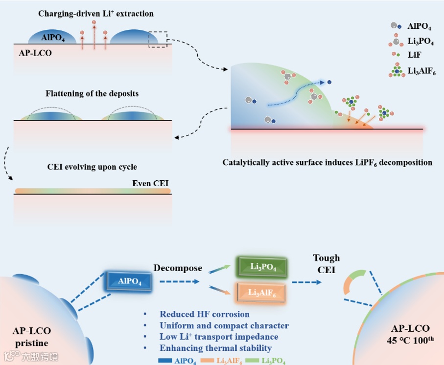 图8展示了AP-LCO表面坚韧CEI的演变过程。在充电过程中,Li+离子从AP-LCO的表面区域迁出,由于AlPO4中Li+传输通道不足,Li+优先从未被表面沉积物阻挡的区域提取。随着电压升高,Li+在表面累积,同时由于LCO的高催化活性,LiPF6分解生成LiF和PF5等副产物。表面沉积物中的AlPO4分解为Al3+和PO43-,并与Li+、LiF、PF5等反应生成导电的Li3AlF6。随着循环进行,沉积物逐渐平整,最终形成均匀致密的CEI。特别是在45°C下,AP-LCO的表面沉积物促进了富含无机物的CEI的原位形成,CEI中含有导电的Li3AlF6。这种坚韧的CEI在增强LCO在45°C下的循环稳定性方面起到了关键作用,表现为增强的抗HF腐蚀能力、表面退化抑制、Li+传输效率提高和热稳定性增强。