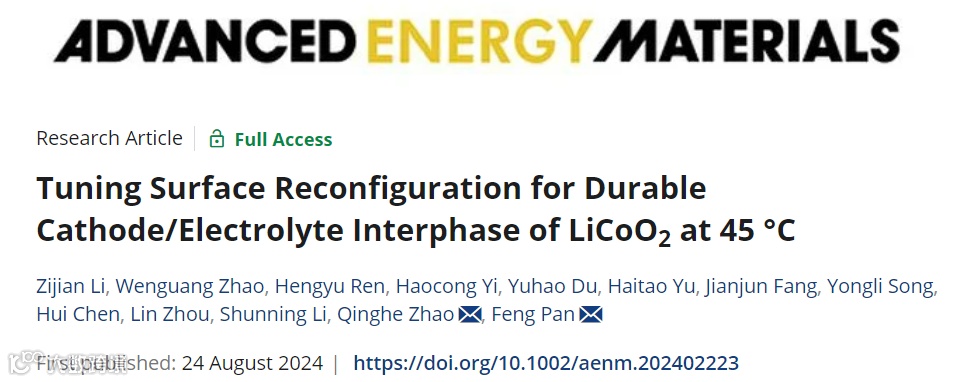 近日,来自北京大学深圳研究生院的潘锋教授与赵庆贺老师在国际知名期刊Advanced Energy Materials上发表题为“Tuning Surface Reconfiguration for Durable Cathode/Electrolyte Interphase of LiCoO2 at 45 °C”的文章。该文章揭示了在铝/磷掺杂钴酸锂(AP-LCO)表面形成稳固的正极/电解液界面(CEI)过程中,“从AlPO4到Li3AlF6/Li3PO4”的演变。这种表面重构伴随着CEI物理和化学性能的提升。重构后的CEI表现出均匀且致密的特性,包含导电的无机物质,在45°C/4.6V下为AP-LCO提供了强大的保护。