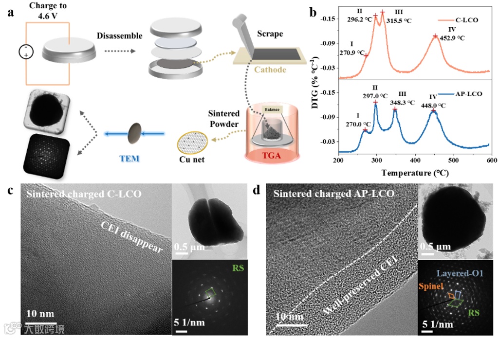 对于两个LCO样品,反应I、II和IV的温度几乎相同,主要差异出现在反应III。由于优化后的CEI,AP-LCO的反应III温度显著降低,表明其在防止表面Co-O晶格氧损失方面具有更高的热稳定性。600°C Ar气氛下烧结后的充电态LCO表面结构对比显示,C-LCO的CEI消失,表面完全转变为RS相,表明发生了大量氧损失。而AP-LCO的CEI仍保持良好,厚度为10 nm。衍射图案显示,AP-LCO表面存在层状(O1)、尖晶石和RS相的混合结构,显示出其在抵抗氧损失方面的更高结构稳定性,这归功于坚韧的CEI。