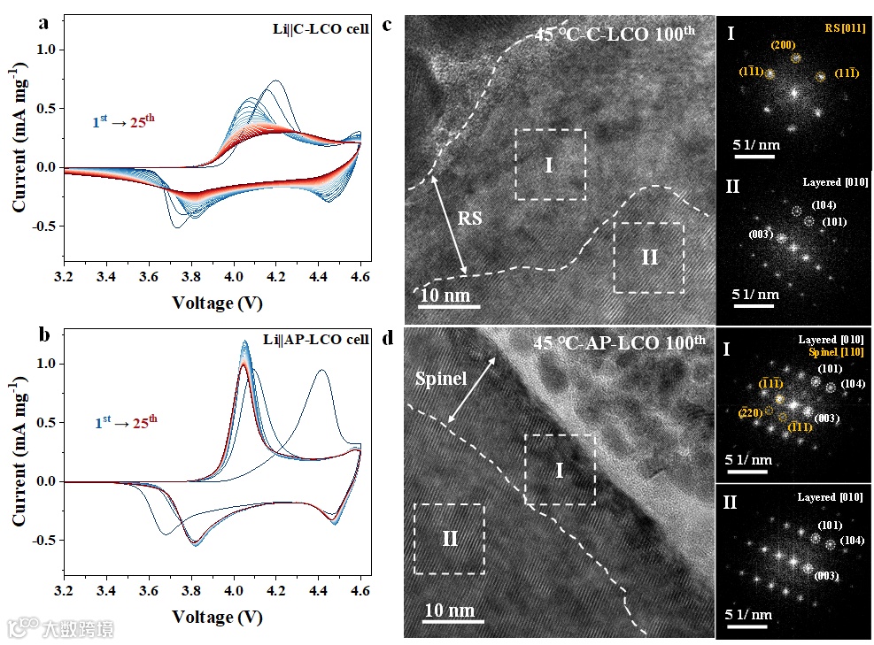 通过湿法涂覆制备的LCO(AP-LCO)成功在其表面形成了AlPO4/Li3PO4涂层。X射线衍射分析显示,AP-LCO的晶体结构与C-LCO基本一致,表明表面涂层对整体晶体结构影响不大。涂覆后,AP-LCO表面均匀覆盖着岛状纳米颗粒,尺寸约为50-200 nm,厚度在10-20 nm之间,主要由铝、氧和磷元素组成。高分辨率透射电子显微镜和选区电子衍射进一步确认了Li3PO4和AlPO4的存在。此外,AP-LCO表面形成了一层5-10 nm厚的相变层,由尖晶石相和层状相的混合物构成,与C-LCO表面的单一层状相相比,具有显著差异。亚表面区域的尖晶石相与层状相混合物在结构上更加稳定,防止结构坍塌,并为Li+传输提供更顺畅的通道。